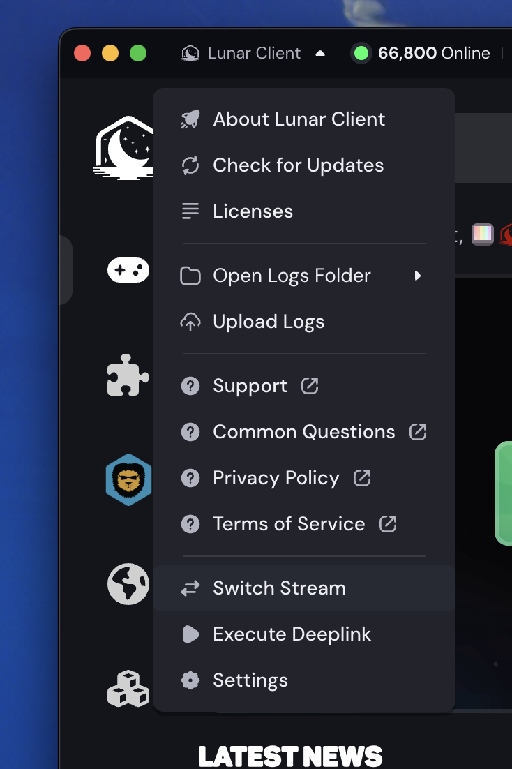 4. Expand the "Lunar Client" dropdown at the top left, and select "Switch Stream".
